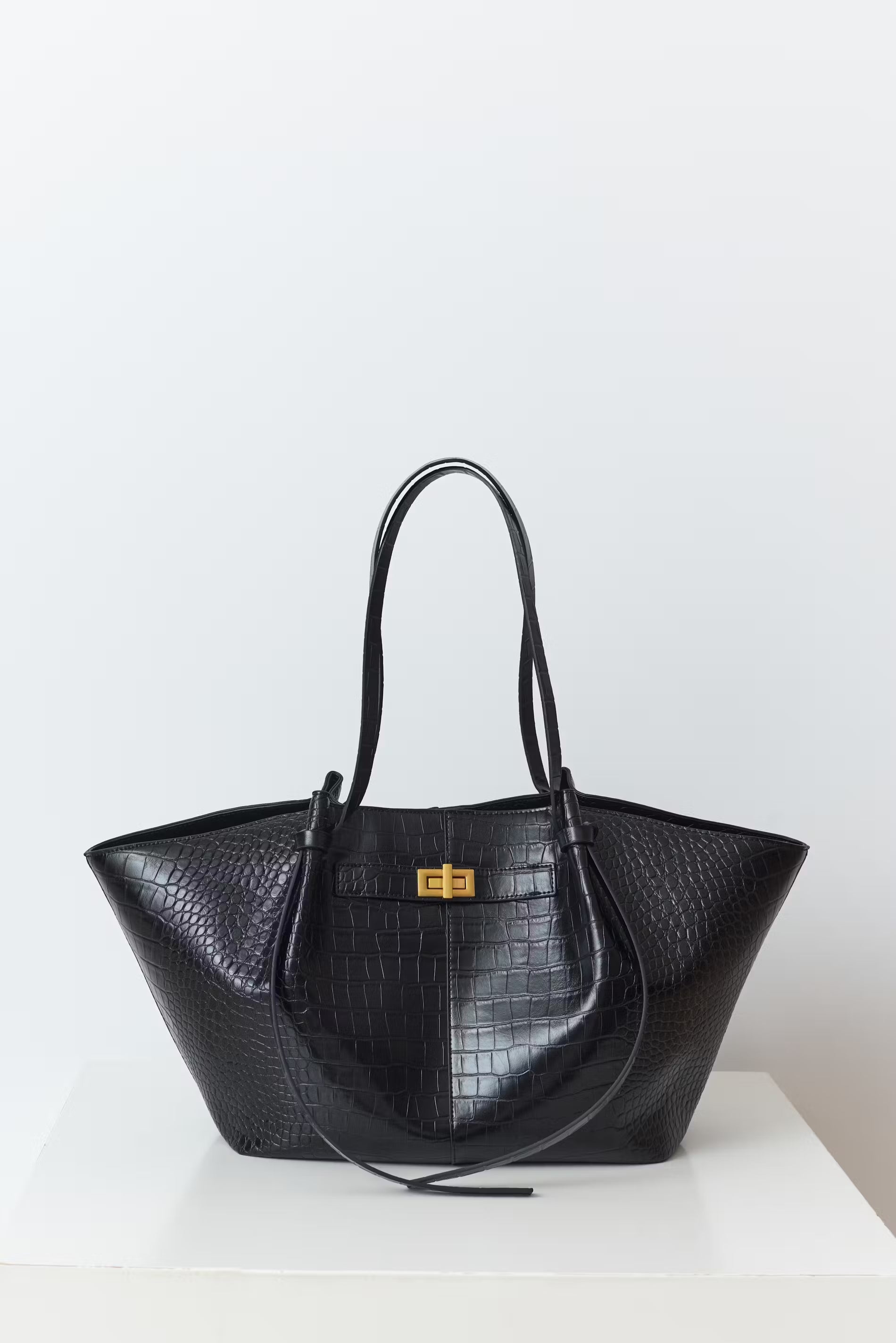 Grand sac en imitation cuir avec doubles poignées. Le sac est beige et a boucle dorée. Il a fermeture aimantée et compartiment intérieur.