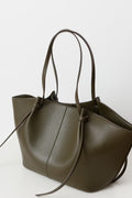 Grand sac en imitation cuir avec doubles poignées. Le sac a boucle dorée. Il a fermeture aimantée et compartiment intérieur.