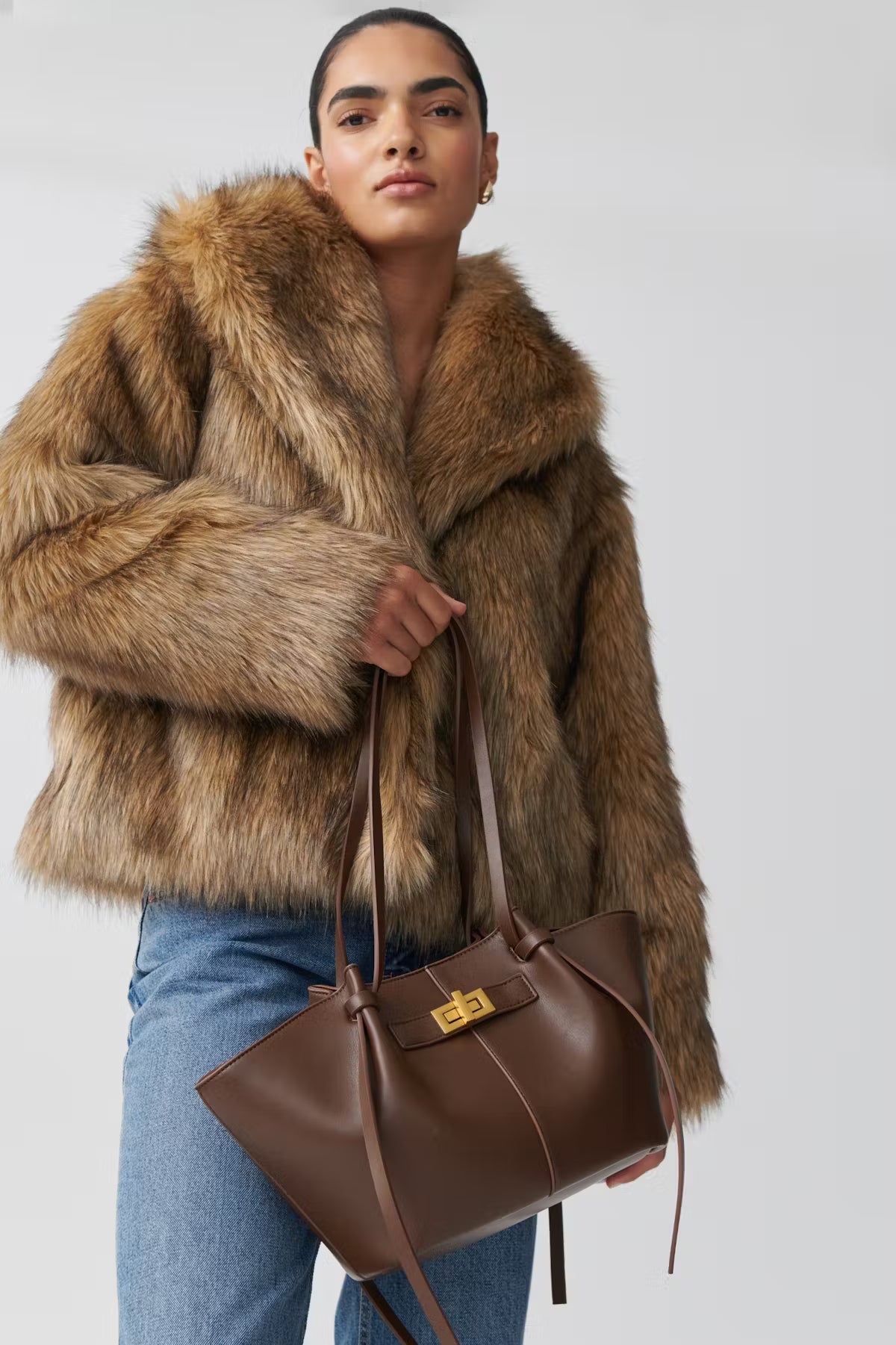 Petit sac en imitation cuir avec doubles poignées. Le sac a boucle argentée. Il a fermeture aimantée et compartiment intérieur.