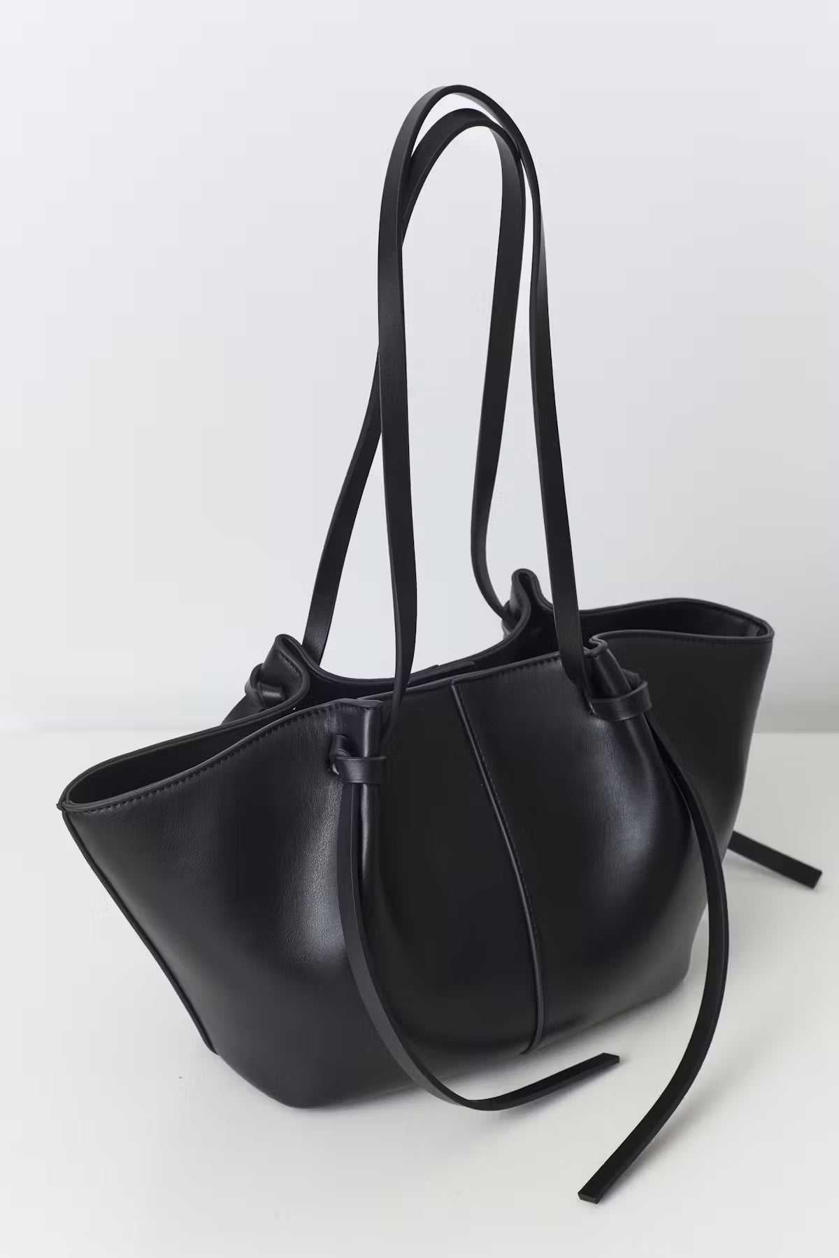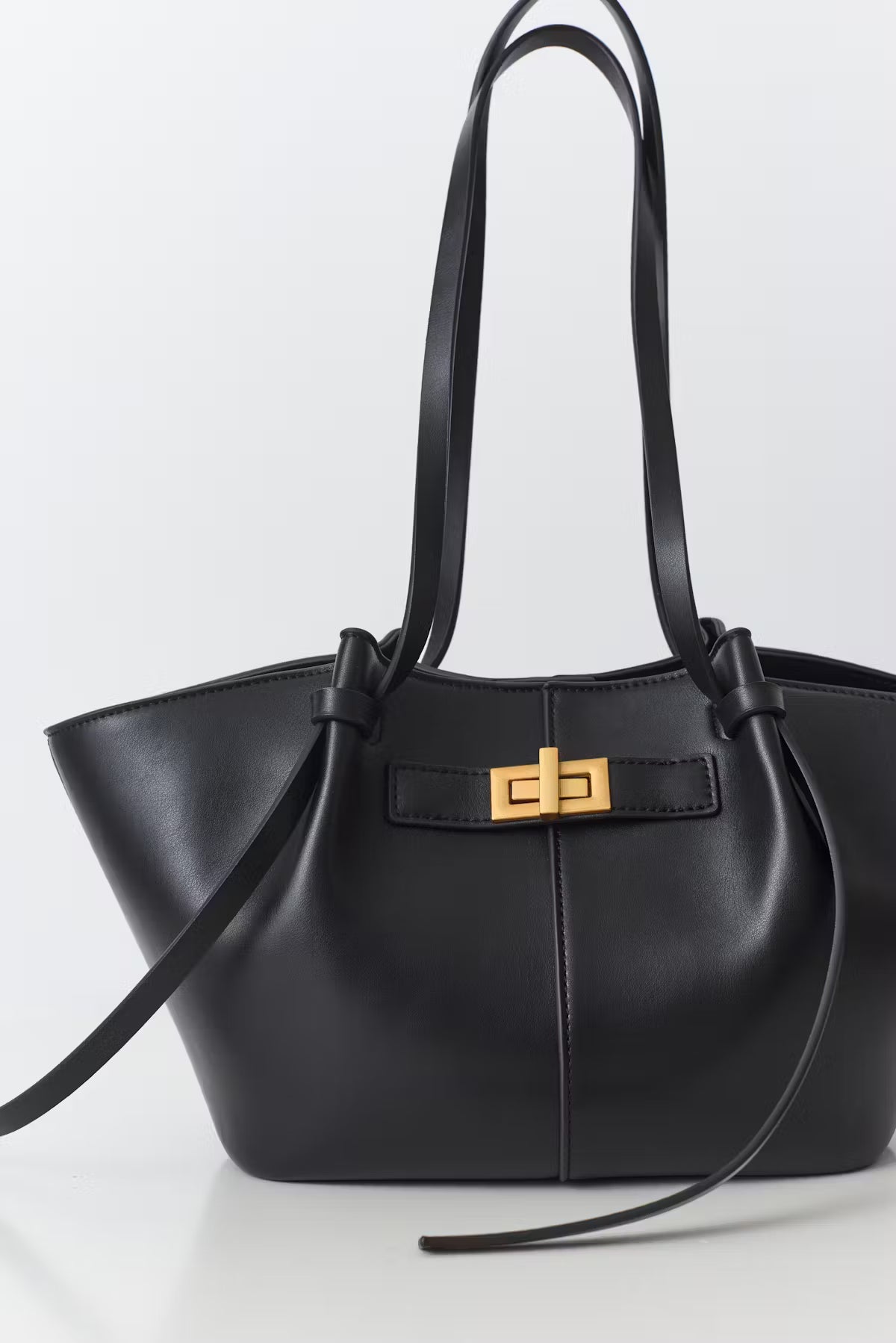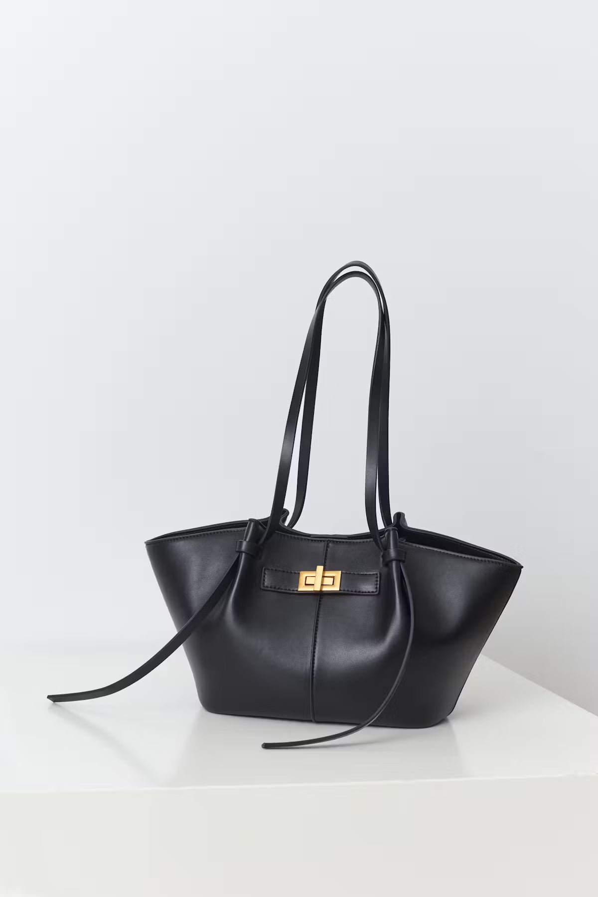 Petit sac en imitation cuir avec doubles poignées. Le sac a boucle argentée. Il a fermeture aimantée et compartiment intérieur.